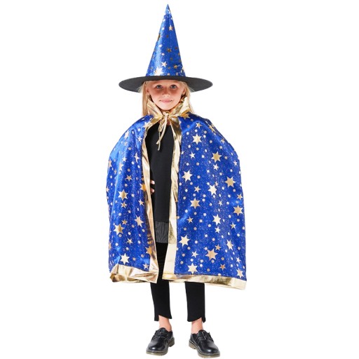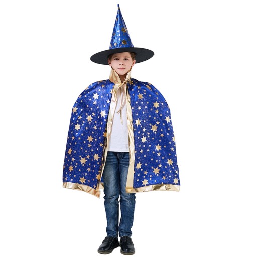 ⭐ Peleryna i kapelusz w kolorze niebieskim, ozdobione złotymi gwiazdkami,