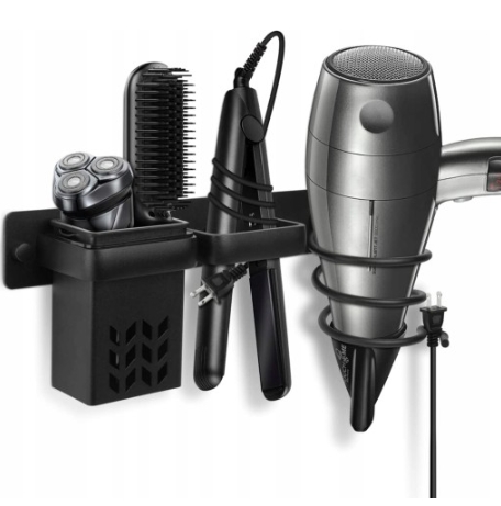 - Ta ścianka uchwytu na suszarkę do włosów ma 3 sekcje, w jednej z nich znajduje się metalowy kubek, dodatkowe miejsce do przechowywania dodatkowych produktów do włosów i kosmetyków.