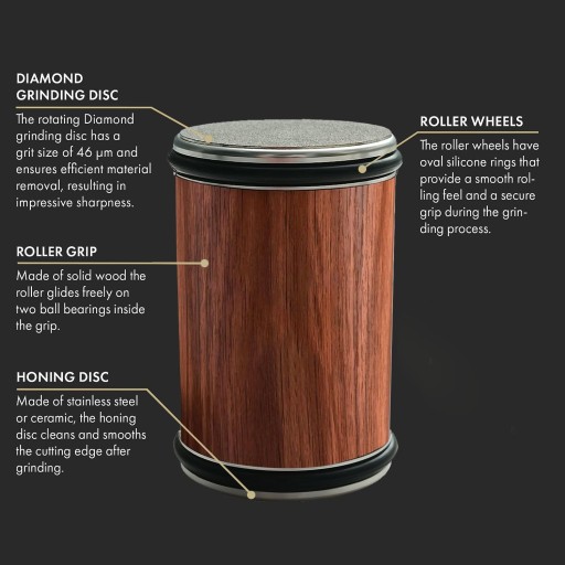 About this item 【Efficient and Versatile】: Engineered in Germany: Our knife sharpener is meticulously crafted in Germany The Knife Sharpener Kit offers a comprehensive solution for all your knife sharpening needs. The rolling countertop tool set allows you to sharpen and hone your kitchen knives effortlessly, ensuring optimal cutting performance. 【Professional-Grade Sharpening Stone】: Included in the kit is a high-quality kitchen knife sharpening stone, designed to provide precise and consistent results. The sharpening stone is crafted from durable materials, ensuring longevity and superior sharpening performance. 【User-Friendly Design】: The rolling countertop design of this knife sharpener tool set provides ease of use and convenience. Simply place your knife in the slot and roll the sharpener back and forth for quick and efficient sharpening. 【Unmatched Sharpness】: Achieve razor-sharp precision with our magnetic knife sharpener. Turns any knife into a cutting powerhouse, cutting through any ingredient with ease. But remember to handle your knives carefully as they are very sharp! 【Compact and Portable】: This knife sharpener kit is compact in size, making it convenient for storage and transportation. Whether you're at home or on the go, you can easily maintain the sharpness of your knives with this portable tool set. Product Description