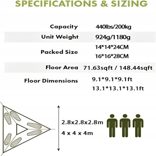 ☘Opis produktu ☘Specyfikacja: ☘Nazwa: hamak wieloosobowy ☘Materiał: siatka poliestrowa ☘Kolor: czarny, zielony ☘Nośność: około 200kg ☘Rozmiar: 280x280x280CM ☘Pakiet zawiera: ☘1 x hamak trójkątny ☘3 x klamra typu D ☘Pasek 3 x 3 metry ☘1 x torba do przechowywania ☘Uwaga: ☘Możesz usiąść lub położyć się podczas korzystania z hamaka, a nie możesz stać na hamaku i skakać. To będzie bardzo niebezpieczne.