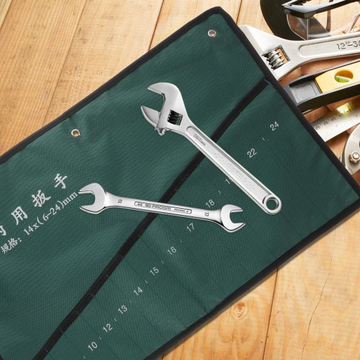 Ten przedmiot jest wykonany z najwyższej jakości materiału, który zapewnia trwałe i długotrwałe użytkowanie. Zintegrowane paski do wiązania mogą utrzymać go zwiniętym, składana klapa zapobiega wypadaniu narzędzi. Ten zwijany projekt może zaoszczędzić miejsce. Jest to okazja do przechowywania kluczy lub ogólnych narzędzi ręcznych.