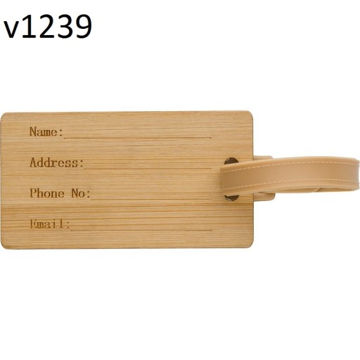 Bambusowa zawieszka do bagażu z regulowanym plastikowym zapięciem.
