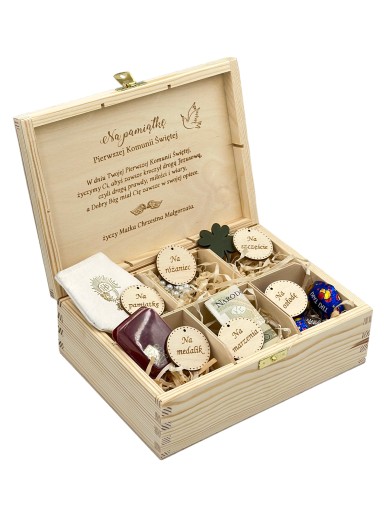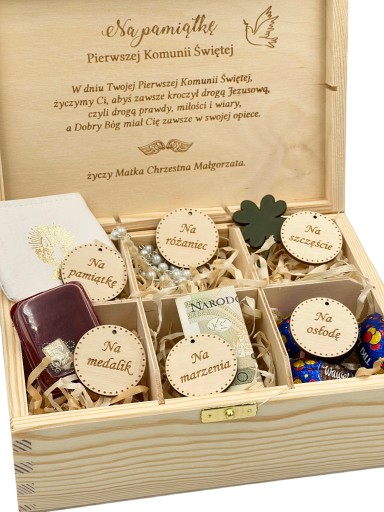 Do pudełka można włożyć różaniec, pieniądze i medalik w jednym, co sprawia, że pudełko będzie wyjątkową pamiątką z tej okazji.