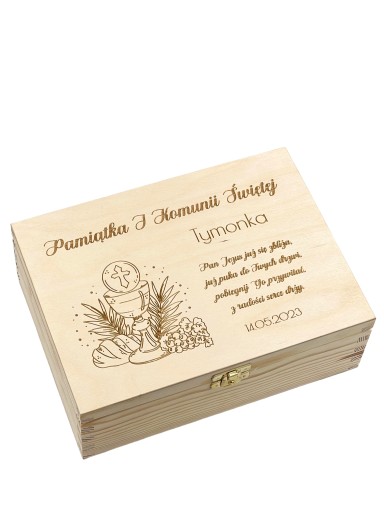 Na pudełko znajduję się piękny grawer nawiązujący do tradycji kościoła, oraz ukazujący symbole tego ważnego dnia.