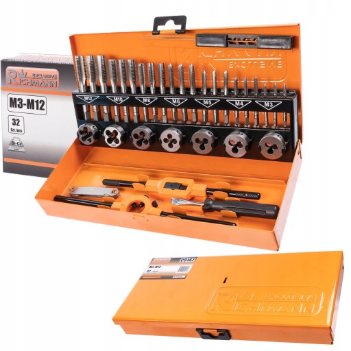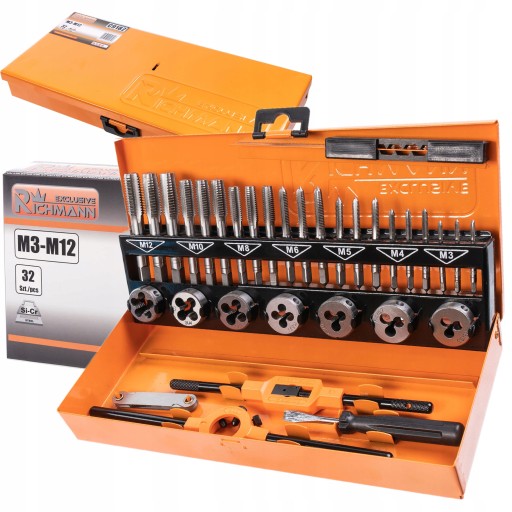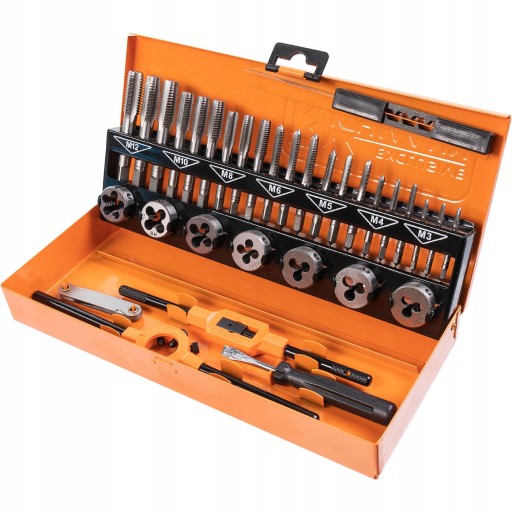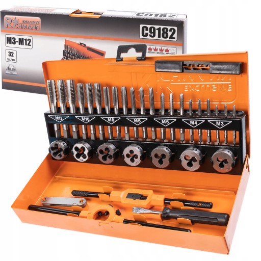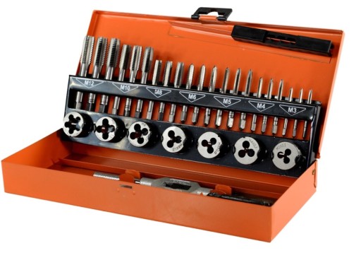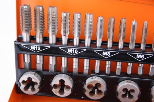- Zestaw gwintowników i narzynek wykonany jest ze stali krzemowo-chromowej (Si-Cr)