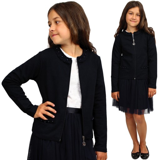 - kołnierzyk dookoła przeszyty fantazyjną dzianinową tasiemką, z przodu dodatkowo ozdobiony granatowymi perełkami