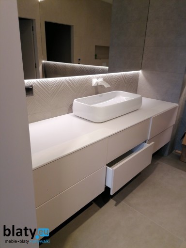 Blaty możemy wykonać w dowolnym wymiarze, w wielu kolorach. W blacie możemy wykonać otwór pod umywalkę nablatową, podwieszaną, baterię, ręcznik czy inny nietypowy otwór.