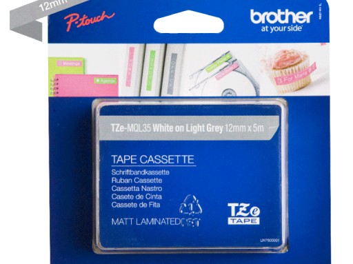 Matowa taśma TZe-MQL35 firmy Brother – biały nadruk na matowym szarym tle, 12mm szerokości