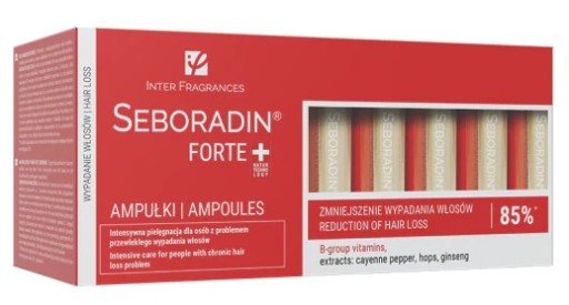 Ampułki Seboradin FORTE wzmacniają i zagęszczają przerzedzone włosy z zakolami. Pozytywnie wpływają na zahamowanie wypadania. Pielęgnacja włosów i skóry głowy w przypadku łysienia androgenowego. Dla kobiet i mężczyzn.