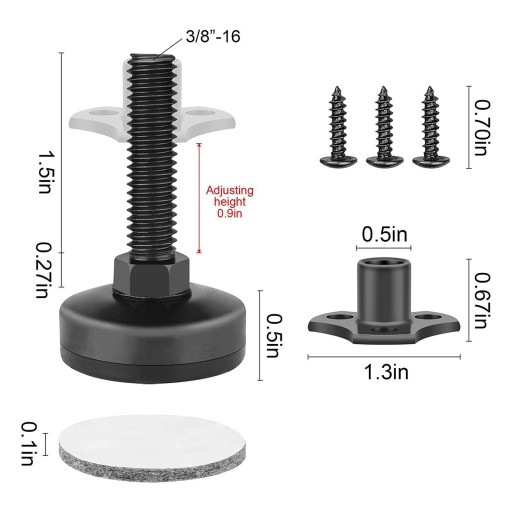 [Uniwersalny projekt] zrób swój stół, proste nowoczesne wyrównywacze mebli stołowych są szybką i łatwą instalacją i mogą pasować do różnych stylów dekoracji pokoju. Rozmiar: średnica podstawy 35mm/1.4 "; wysokość podstawy 12mm/0.5"; Długość śruby 38mm/1.5 "; średnica nakrętki T 24mm/0.9"; Wysokość nakrętki T 10mm/0.4 "; Grubość filcu 3.4mm/0.1".