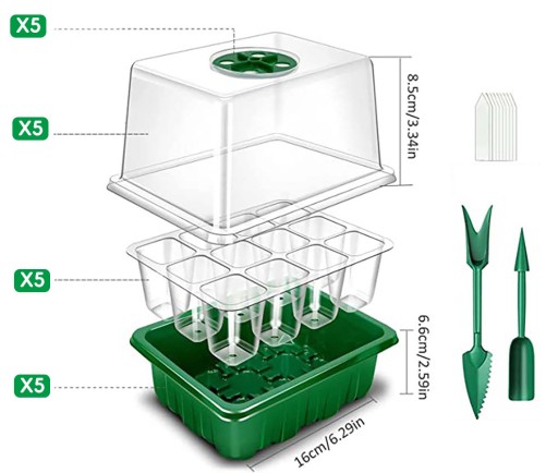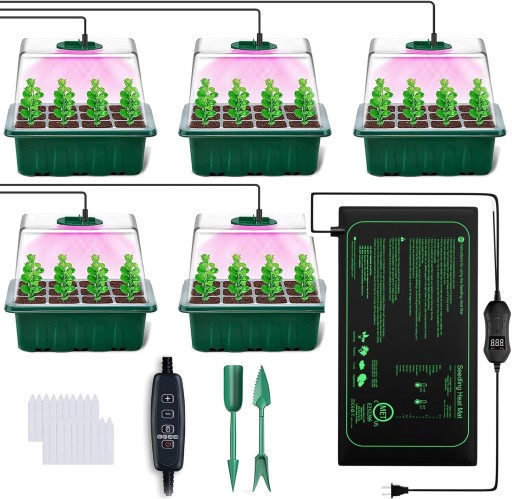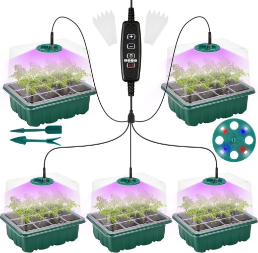 1 x mata grzewcza, Każdy zestaw startowy do nasion zawiera 5 tac na nasiona, 5 * kopuł nawilżających, 5 * świateł do uprawy roślin, 1 * inteligentny system sterowania i 5 * tace podstawowe, 2 narzędzia, 10 tagów. Nadaje się do kiełkowania nasion, pielęgnacji sadzonek, hydroponiki, sadzonek sukulentów i innych potrzeb związanych z rozmnażaniem, co czyni go idealnym wyborem dla hodowców.