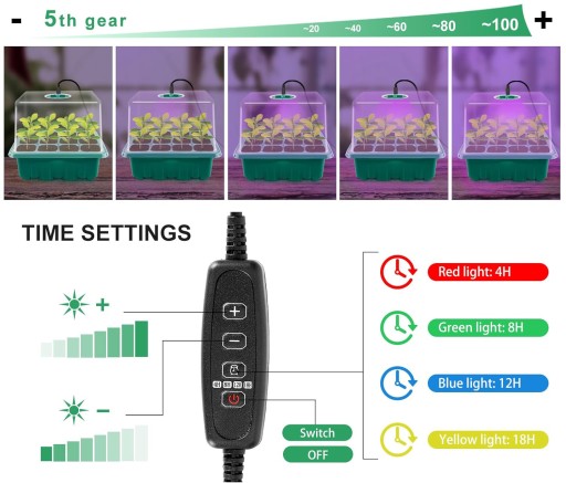 - Taca startowa na nasiona jest wyposażona w inteligentny system sterowania z 5 regulowanymi poziomami jasności dostosowanymi do różnych wymagań oświetleniowych na różnych etapach wzrostu nasion. Umożliwia ustawienie czasu świecenia na 4/8/12/18 godzin, aby symulować naturalne środowisko wzrostu, nawet gdy Cię nie ma, z odpowiednim timerem do automatycznego wyłączania.