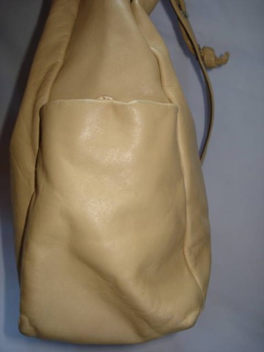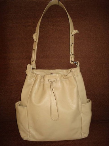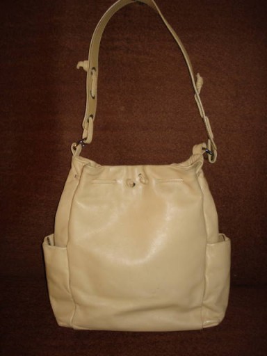 Włoska torebka worek. Wykonana z miękkiej skóry naturalnej/ lekka/. Po bokach kieszonki zapinane na mocny magnes. Wewnątrz przez środek duża kieszeń zapinana na zamek. Po drugiej kieszeń na dokumenty zapinana na zamek oraz kieszonka na telefon. Całą torebka zapinana na mocny magnes i sznurek. Nosi niewielkie ślady użytkowania. Na zewnątrz na dole bardzo delikatne otarcie zupełnie niewidoczne przy użytkowaniu. Jest dosyć pakowna. Proszę o rozważną licytację, bo ofert nie odwołuję.