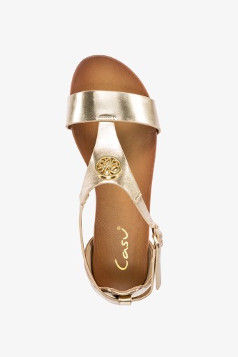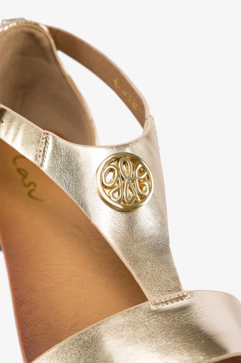 Złote sandały damskie model K24X2-G zostały wykonane z wysokogatunkowej skóry ekologicznej, co gwarantuje doskonałą jakość i dopasowanie do stopy. Szukasz niepowtarzalnego obuwia, które podkreśli Twoją elegancję i wyjątkowość? Prezentujemy Ci złote sandały z najnowszej kolekcji. Te unikatowe buty to połączenie stylu i wygody. Złota ozdoba umieszczona na błyszczącej cholewce nadaje im niepowtarzalnego charakteru i blasku. To detal, który przyciągnie wzrok i uczyni każdy strój wyjątkowym. Takie buty świetnie sprawdzą się na specjalne okazje – wesela, przyjęcia czy ważne spotkania biznesowe. Ale dlaczego by nie nosić ich na co dzień, dodając blasku i wyrafinowania swojemu codziennemu lookowi? Zakryta pięta zapewnia stabilność podczas noszenia, a także ochronę dla wrażliwego obszaru stopy. Zapięcie w formie klamerki to nie tylko stylowy detal, ale także gwarancja, że sandały idealnie dopasują się do Twojej nogi i nie będą się zsuwać. Pasek przechodzący przez środek cholewki dodatkowo stabilizuje stopę i nadaje całości lekkości. Dzięki płaskiej podeszwie zapewniają komfort noszenia przez cały dzień, bez obaw o zmęczenie stóp. Idealne na letnie dni, wakacyjne wieczory czy specjalne okazje. Niezależnie od okoliczności, w tych sandałach poczujesz się pewnie i stylowo. Nie czekaj, odkryj urok i elegancję złotych sandałów. Daj się oczarować ich wyjątkowością i zadbaj o swój komfort podczas każdego kroku.