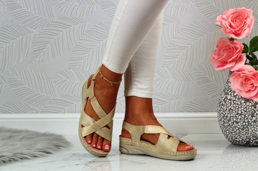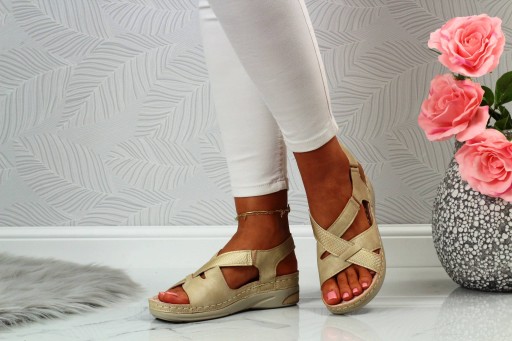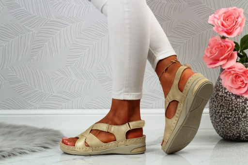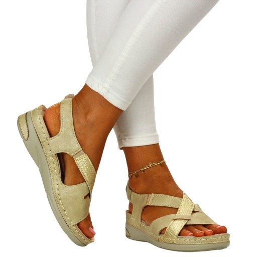 Damskie sandały w kolorze beżowym na niskim koturnie. Idealnie sprawdzą się jako obuwie na co dzień w letnie, upalne dni. Pasek na rzep ułatwia zakładanie obuwia oraz dopasowanie go do stopy. Profilowana, skórzana wkładka zapewnia komfort użytkowania a szyte spody zwiększają wytrzymałość obuwia.