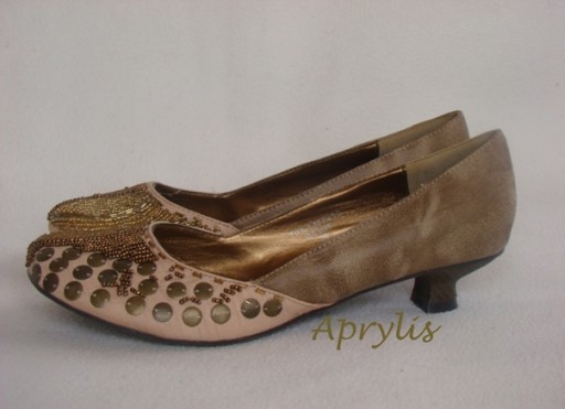czółenka z najnowszej wiosennej kolekcji.buciki są w modnym oliwkowo-beżowym kolorze z ciekawymi niespotykanymi ręcznie wykonanymi aplikacjami.