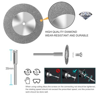 Służy do cięcia różnych twardych materiałów - szkła, kamienia, porcelany, ceramiki, kości, kamienia, betonu, włókna szklanego, ale może być również stosowana do cięcia metali takich jak stal nierdzewna. Aby wydłużyć żywotność tarcz diamentowych, zaleca się stosowanie chłodziwa lub chłodzenia wodą. Wysoka twardość, odporność na zużycie (podlega ochłodzeniu podczas pracy).