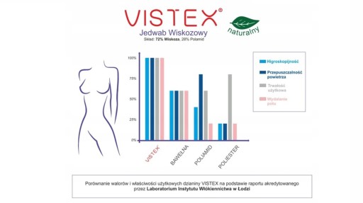 Dzięki właściwościom higroskopowym, Vistex odprowadza wszelką wilgoć (pot) na zewnętrzną warstwę materiału. Dzięki temu, na naszym ubraniu nie tworzą się mokre plamy, a materiał nie przykleja się do ciała, nawet w bardzo wysokiej temperaturze.