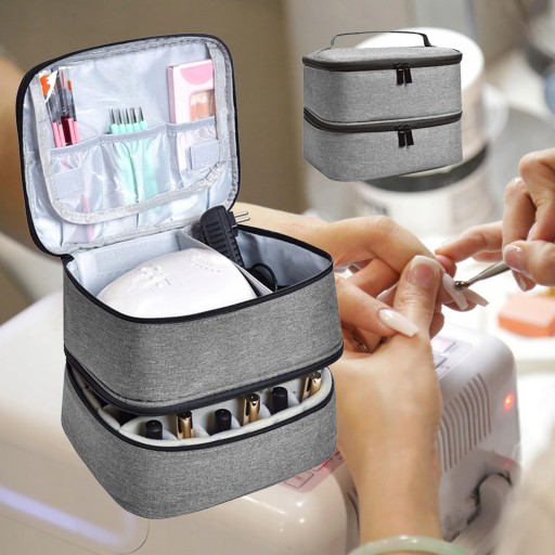 Dwuwarstwowa konstrukcja: podwójna komora, butelki do paznokci i organizer na narzędzia, futerał do przenoszenia zapewnia porządek i porządek.
