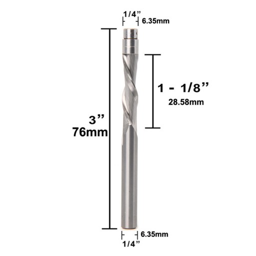 Spiralne wiertła do frezowania górnego idealnie nadają się do szablonów stołów frezarskich, powodując, że wióry drzewne obracają się w dół dala od obszaru obrabianego przedmiotu Dwie niezależne prowadnice kulkowe na końcówce zapewniają płynną pracę każdym