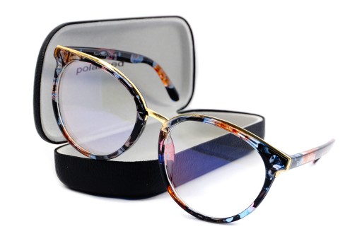 Nowe oryginalne okulary zerówki do komputera antyrefleksyjne i powłoką Blue Light Filter marki PolarZONE w kwiatowy wzór z metką oraz instrukcją użytkowania. Okulary posiadają na wewnętrznej stronie zauszników logo producenta, numer modelu oraz znak certyfikacji CE.