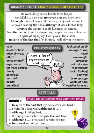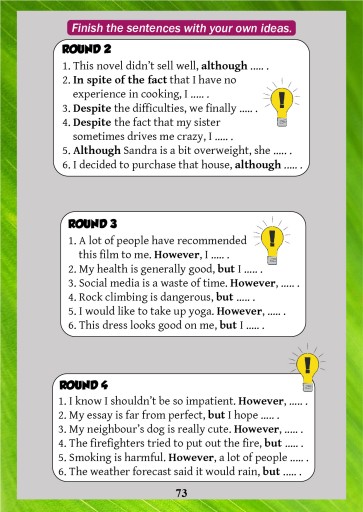 Let’s Talk, Play, and Learn Grammar to niezrównana pozycja, która skupia się na rozwijaniu umiejętności konwersacyjnych poprzez praktyczne zastosowanie gramatyki. Książka ta została stworzona z myślą o uczniach pragnących dokonać szybkich postępów w mówieniu, wyeliminować popełniane błędy oraz poszerzyć swoje słownictwo. Dodatkowo, oferuje ona także element rywalizacji podczas zajęć, wystarczy jedynie zwykła kostka do gry. Dzięki możliwości organizacji przyjaznych zawodów, uczniowie będą zaangażowani i aktywnie uczestniczyć w procesie nauki.