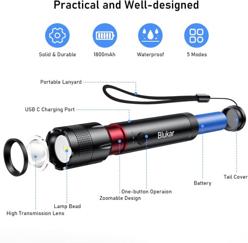 Dzięki wysokiej jakości diodom LED ta latarka LED emituje jasne i równomierne światło, bez migotania i oślepiania, stabilne i długotrwałe oświetlenie, które idealnie spełnia Twoje codzienne potrzeby.