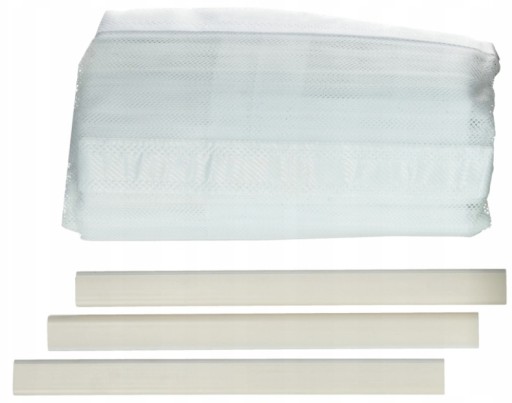 W zestawie znajdują się 2 zasłony z siatki, 12 par rzepów samoprzylepnych oraz 3 górne listwy.