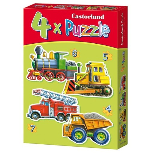 Puzzle dla najmłodszych, składające się z czterech oddzielnych obrazków o zróżnicowanym stopniu trudności. Żywe kolory, odpowiednio dobrane wzornictwo oraz duże elementy sprawią, że małe dziecko z łatwością ułoży każdy obrazek. Puzzle te zapraszają do poznania fascynującego świata bajek, zwierząt i motoryzacji. Pomogą rozwinąć zdolność kojarzenia oraz zwiększyć sprawność manualną.