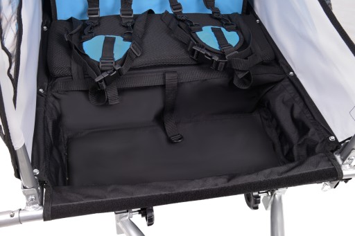 Środek przyczepki wyposażony jest w pasy bezpieczeństwa, zapewniają bezpieczeństwo naszych pociech. Na siedzisku znajduje się poducha, zapewniająca wygodne siedzenie.