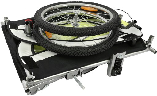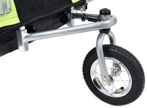 Za pomocą dwóch pokręteł można szybko przełożyć przednie koło na tył przyczepki. Pozwala to nam na szybką zmianę przyczepki w jogger.
