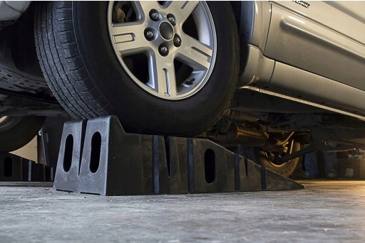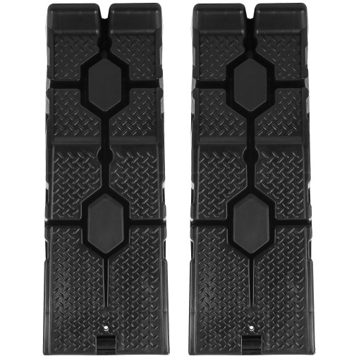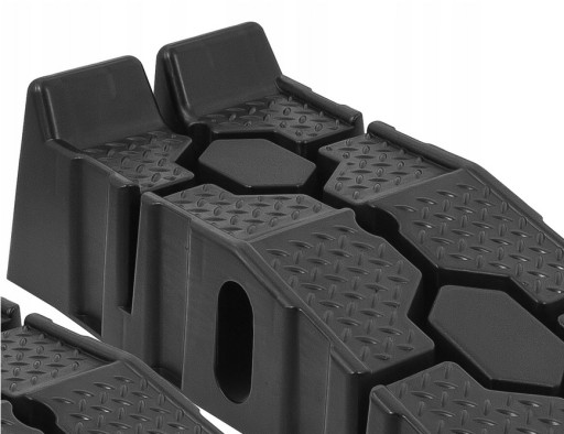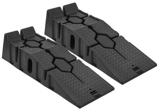 Uniwersalne rampy podjazdowe do samochodów osobowych. Łagodny podjazd. Wysoki próg bezpieczeństwa zabezpieczajacy stoczeniu się auta do przodu. Specjalne żłobienia w tworzywie zwiększajace przyczepność. Unikalna konstrukcja ułatwiająca przechowywanie i magazynowanie ramp.