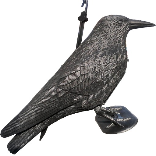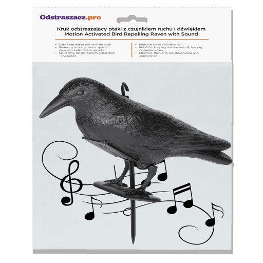 - Realistyczne dźwięki: Odgłosy prawdziwego kruka wzmacniają efekt odstraszający.
