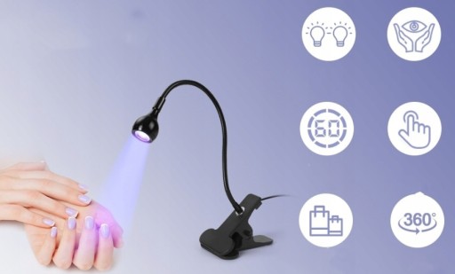 Lampkę przymocować do biurka dolnym klipsem i utwardzać sam początek stylizacji na górnych formach ( /- 10sekund). Po zdjęciu formy, zaciskamy kształt i kontynuujemy utwardzanie w klasycznej lampie.