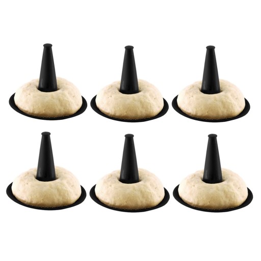 - Stożkowy kształt formy pozwala nadać i zachować charakterystyczną dla bajgla formę z dziurką pośrodku