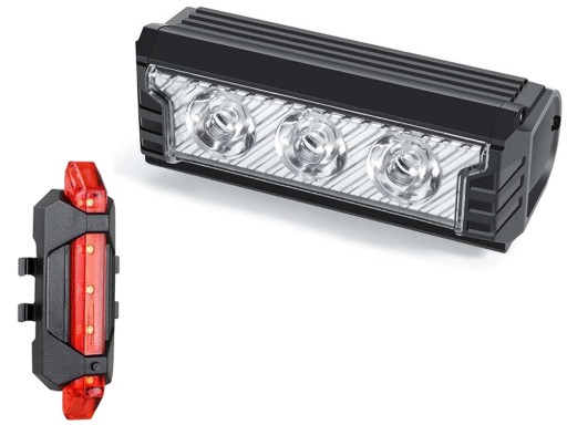 Zestaw lampek rowerowych można ładować za pomocą kabla USB, podłączając je do dowolnego urządzenia z portem USB, takiego jak komputer, ładowarka samochodowa czy powerbank. Przednia lampka posiada wskaźnik naładowania.