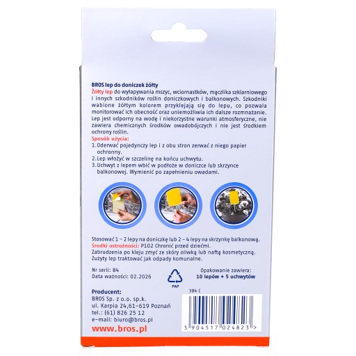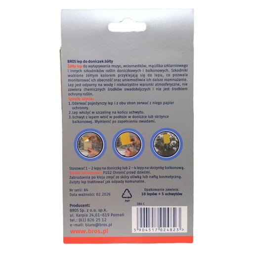 Pułapka klejowa do wyłapywania szkodników żerujących na doniczkowych roślinach ozdobnych. Żółty kolor tabliczek przyciąga owady żerujące na roślinach. Zwabione owady przyklejają się do pułapki i w ten sposób zostają unieruchomione, co uniemożliwia ich dalsze rozmnażanie, a także pozwala zaobserwować moment ich pojawienia się oraz liczebność. Preparat nie zawiera chemicznych środków owadobójczych, nie jest środkiem ochrony roślin. Preparat odporny na niekorzystne warunki atmosferyczne.