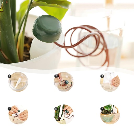 - ➖ Łatwy w instalacji i obsłudze. Zdejmij zakrętkę i napełnij ją wodą. Pozostawić do namoczenia w misce na 15 minut. Następnie włóż kołek do doniczki, a plastikową rurkę do pojemnika na wodę.