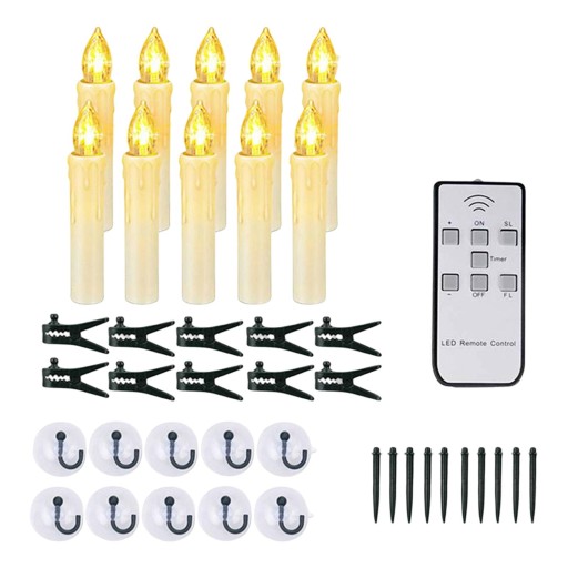 Wielofunkcyjne świece: każda bezpłomieniowa świeca LED jest dostarczana z klipsami, kołkami i haczykami z przyssawkami. Klip: Przypnij świecę do drzewa lub doniczki. Przyssawka: może być adsorbowana na gładkich powierzchniach, takich jak okna. Kołek: można go podłączyć do trawnika.