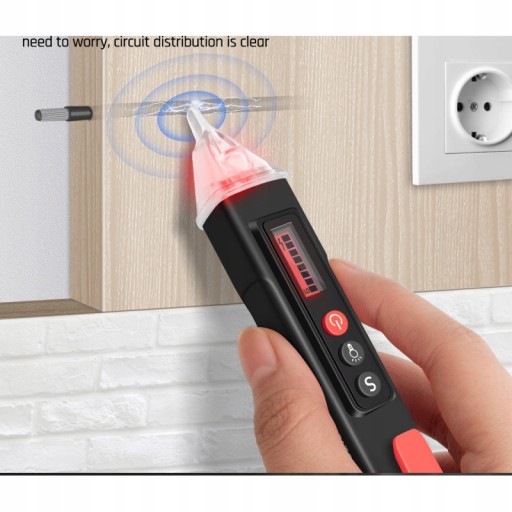 VC1010 jako przykład Bezkontaktowy cyfrowy czujnik napięcia pióra Cechy. Napięcie AC: 12V - 1000V Częstotliwość: 50Hz/60Hz Tryb alarmowy: akustyczny/optyczny/analogowy Wyświetlacz: ekran LCD Pochodnia: Tak Kształt sondy: płaski Wskaźnik niskiego poziomu baterii: tak Ogień i przewody zerowe: dźwiękowy/optyczny/analogowy wyświetlacz LCD Czułość bezdotykowa: regulowana Automatyczne wyłączanie: 3 minuty bez detekcji lub bez pracy Zasilanie: 2 x baterie AAA (nie dołączone) Specyfikacje. Materiał: ABS Typ: Bezkontaktowy detektor napięcia AC Rozmiar: 20x6x6cm Pakiet zawiera. 1 x bezdotykowy detektor napięcia AC (baterie nie są dołączone). 1 x Instrukcja obsługi