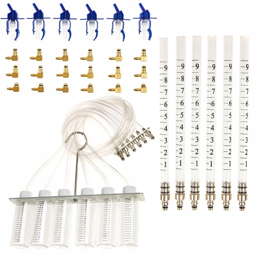 - Zestaw umożliwia badanie do 6 wtryskiwaczy równocześnie, dzięki czemu jest wydajny i efektywny. Może być stosowany w wtryskiwaczach firm takich jak Bosch, Siemens, Delphi, Denso. Za pomocą menzurek i złączek, użytkownik może precyzyjnie i dokładnie zmierzyć ilość paliwa oddawanego na listwę powrotną, co pozwala na ocenę stanu wtryskiwaczy oraz diagnozowanie ewentualnych problemów z silnikiem.