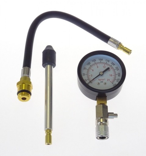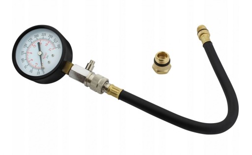 - Tester ciśnienia sprężania 3 elementy to wysokiej jakości narzędzie, zaprojektowane specjalnie do pomiaru ciśnienia w silnikach benzynowych. Zestaw składa się z manometru analogowego z zaworem zwrotnym i spustowym o skali 0-20 bar (0-300 PSI), elastycznego węża gumowego o długości około 30 cm oraz trzech końcówek o różnych wymiarach - gwintowanej M14, M18 i stożkowej gumowej (12-20 mm). Końcówka M18 jest nakręcana na M14, co pozwala na jeszcze szersze zastosowanie zestawu.