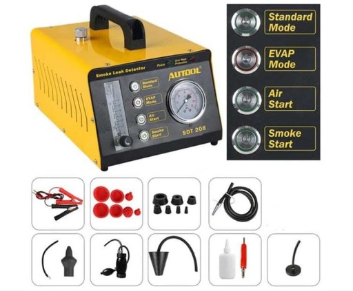 Profesjonalny automatyczny tester szczelności rur, węży, złączy, instalacji przy użyciu generatora dymu. Pomoże nam to w szybkim i dokładnym zlokalizowaniu wycieków w układach rurowych w ciągu kilku minut. Możliwość wykorzystania urządzenia przy testach układu dolotowego, test układu wydechowego, test układu chłodzenia, test uszczelnienia samochodu, test układu zbiornika paliwa, test różnych złączek rurowych.