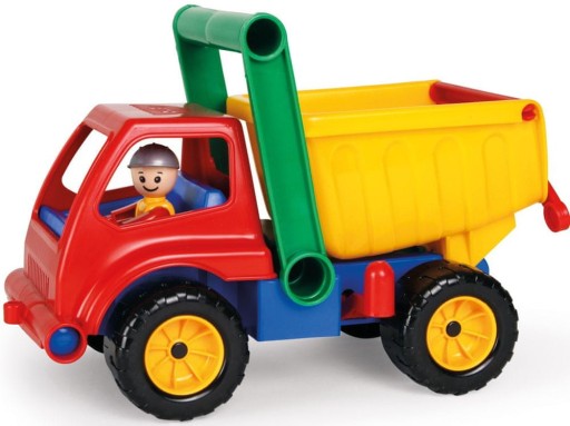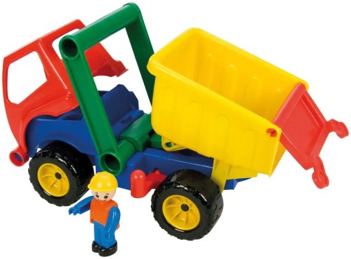 Super kolorowa wywrotka z wysokimi burtami. Pojazd posiada 2 osie i blokadę naczepy. Ponad kabiną znajduje się rączka do wygodnego sterowania pojazdem. W kabinie jest figurka kierowcy. Pojazd ma 27 cm długości.