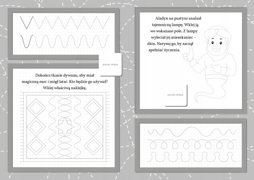 Ćwiczenia pobudzają wyobraźnię i pozwalają kreatywnie spędzić czas, a kolorowe naklejki umilają naukę poprzez zabawę.