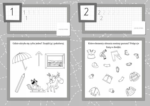 Znajdź i przyklej naklejki. Dobieranie naklejek jest ćwiczeniem na kojarzenie, a odpowiednie wklejanie uczy staranności.
