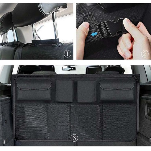- Przy gwałtownym hamowaniu wszystkie przedmioty umieszczone w organizerze zostaną na swoim miejscu. Można go umiejscowić w bagażniku lub na tylnych siedzeniach samochodu.