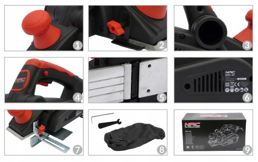 Elektryczny strug do drewna firmy NAC o mocy silnika 910 W z płynną regulacją głębokości strugania oraz funkcją frezowania ( felcowania ). Maksymalna szerokość robocza urządzenia to 82 mm oraz głębokość strugania od 0 do 3 mm.