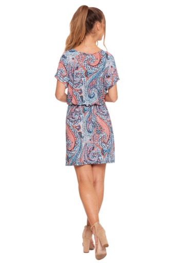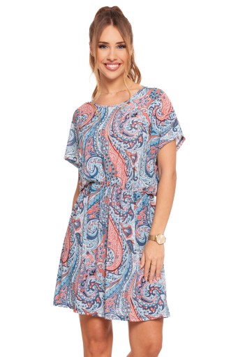 Krój sukienki jest luźny, z elastycznym pasem w talii, co umożliwia dopasowanie do różnych typów sylwetek, jednocześnie podkreślając figurę. Krótkie rękawy i okrągły dekolt dodają jej casualowego charakteru, a długość do kolan sprawia, że jest ona uniwersalnym wyborem na wiele okazji.