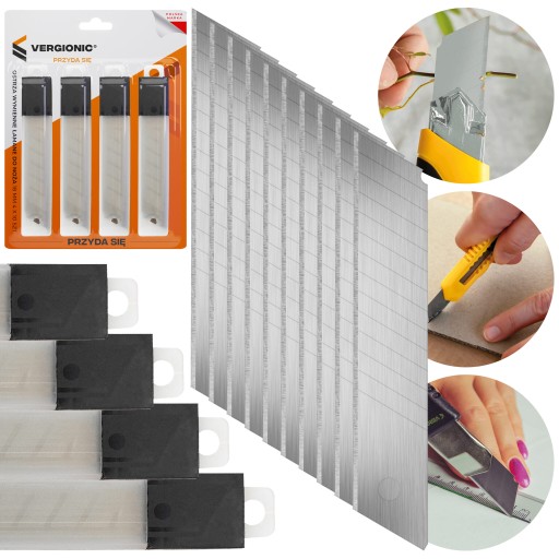 W zestawie znajduje się 40 ostrzy, co zapewnia długotrwałe użytkowanie i eliminuje konieczność częstego wymieniania noży. Ostrza te są specjalnie zaprojektowane do pracy z nożami łamanymi o standardowej szerokości 18 mm. Ich uniwersalny rozmiar sprawia, że są odpowiednie do różnych zastosowań, od cięcia papieru, tektury, do bardziej wymagających prac z tworzywami sztucznymi, tapetą czy sklejką.